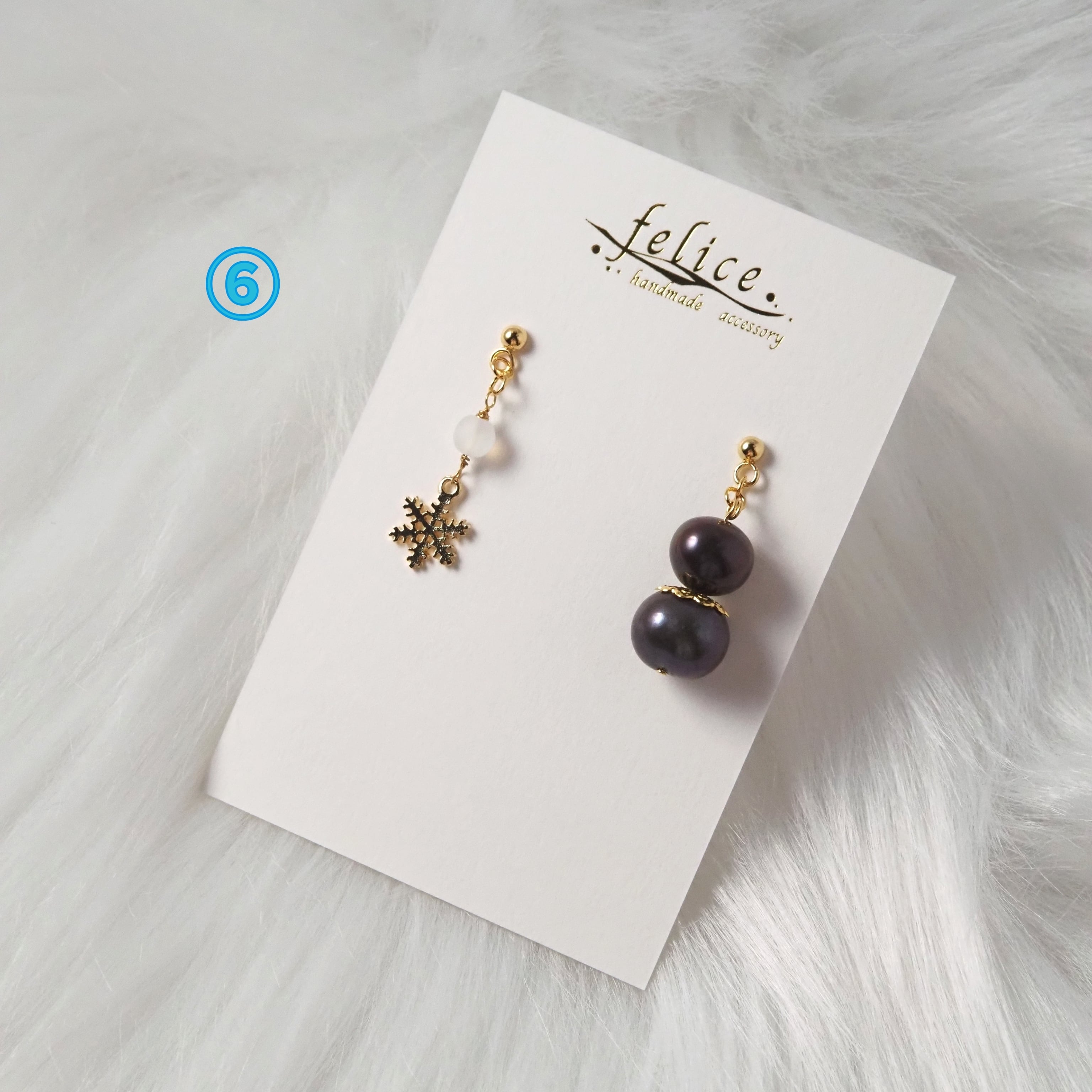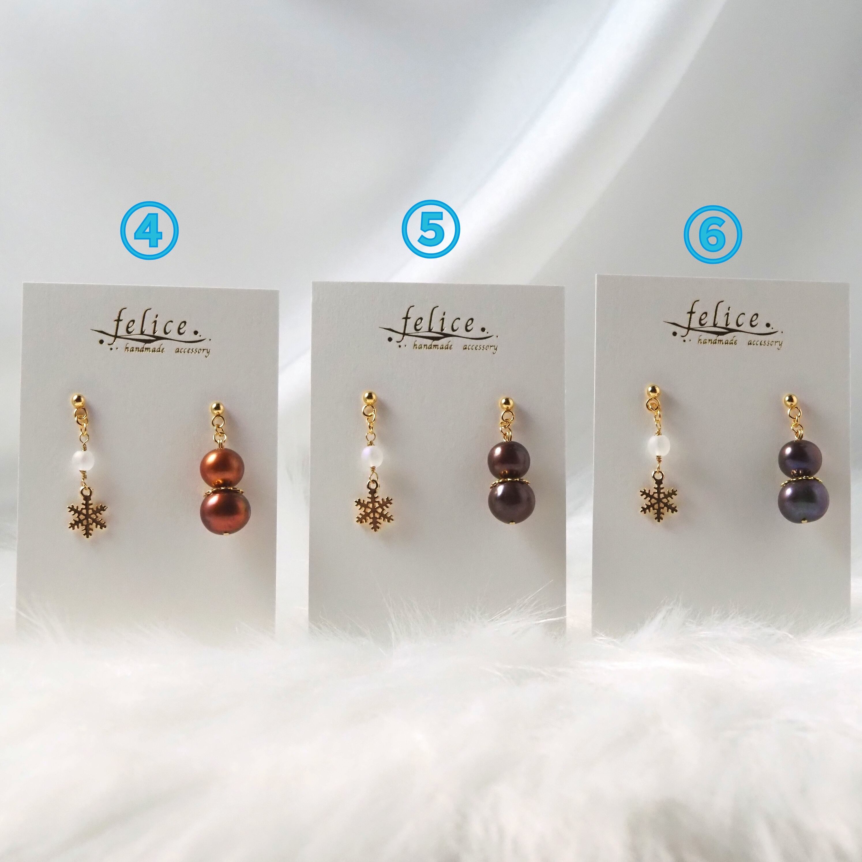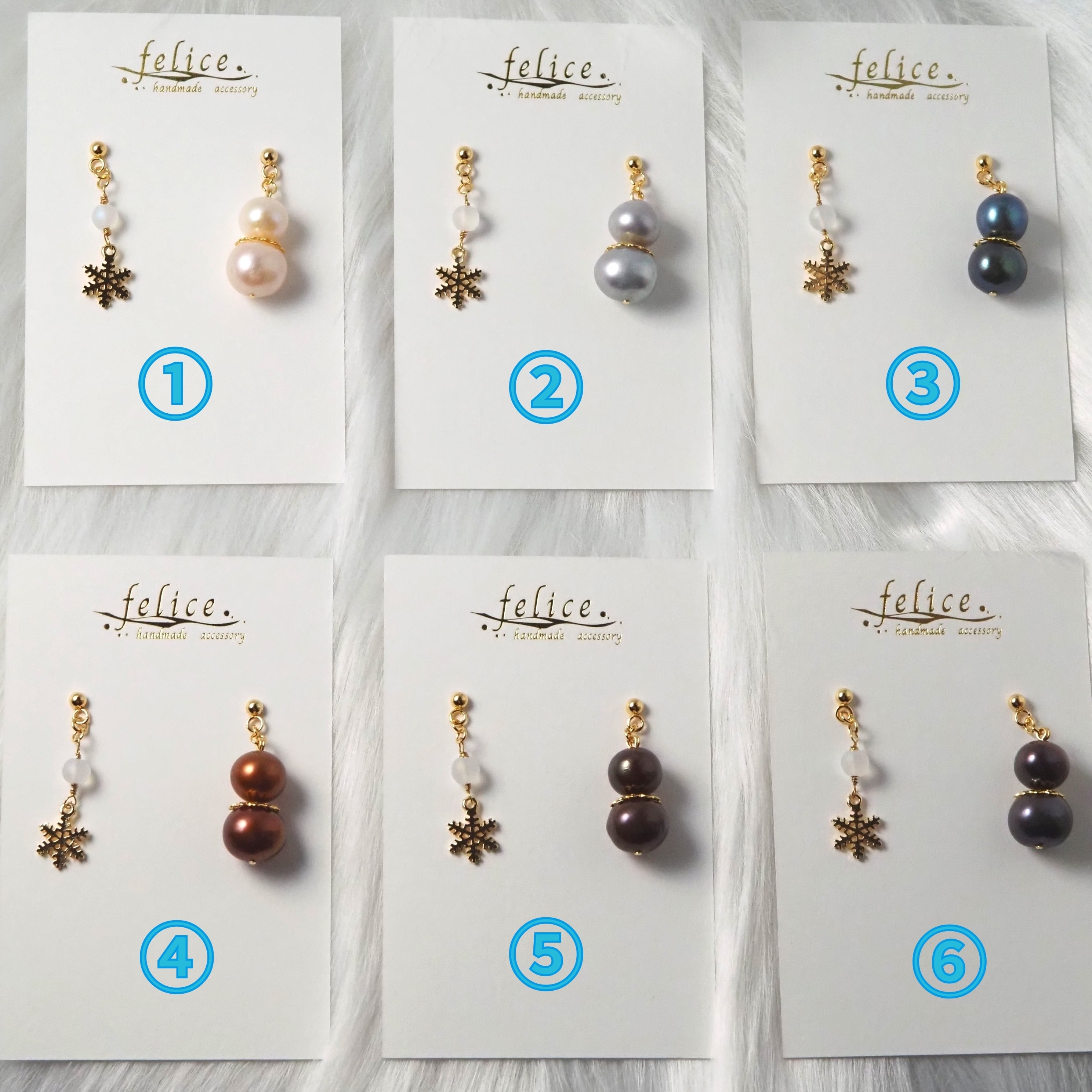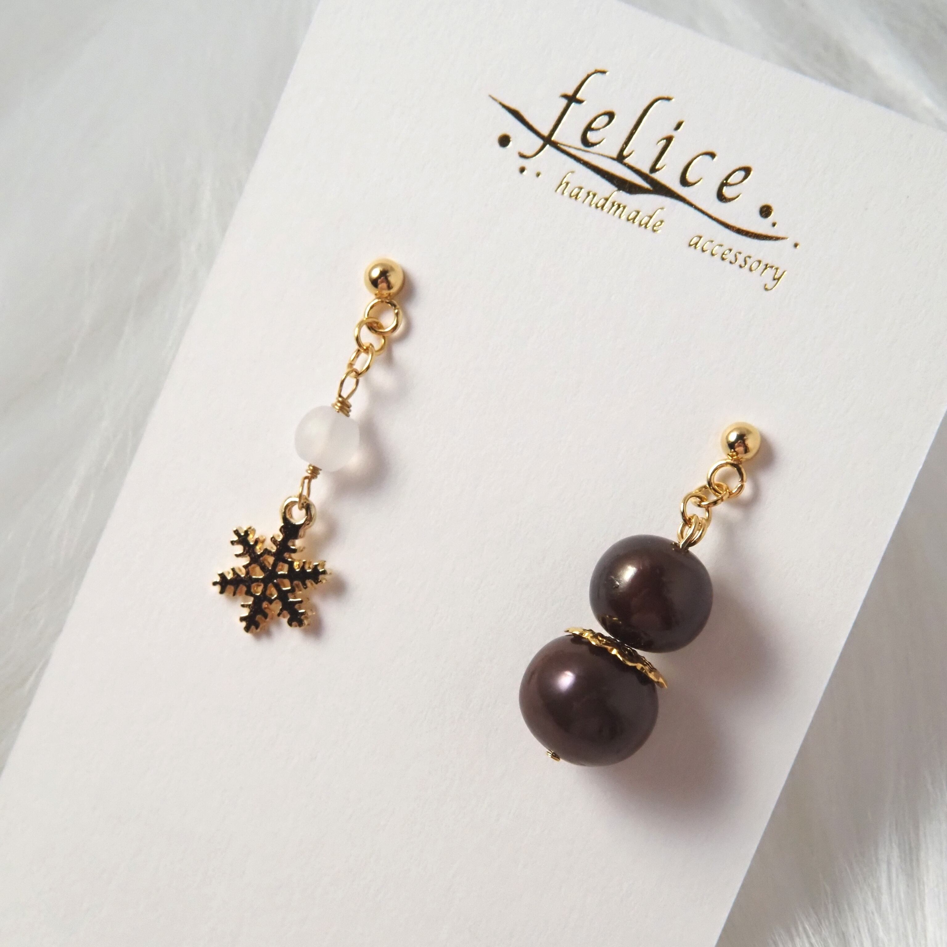 揺れるレジンピアスのハンドメイド通販 felice です。こちらは~雪だるまパール(④〜⑥) アシメデザイン〜の商品ページです。