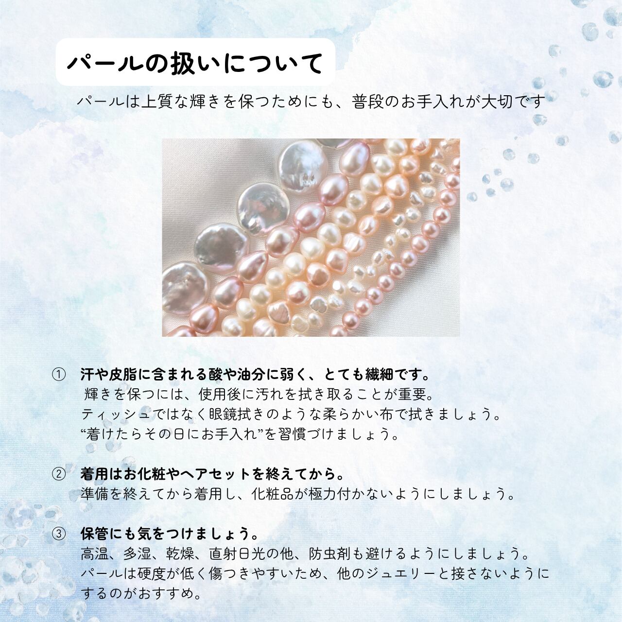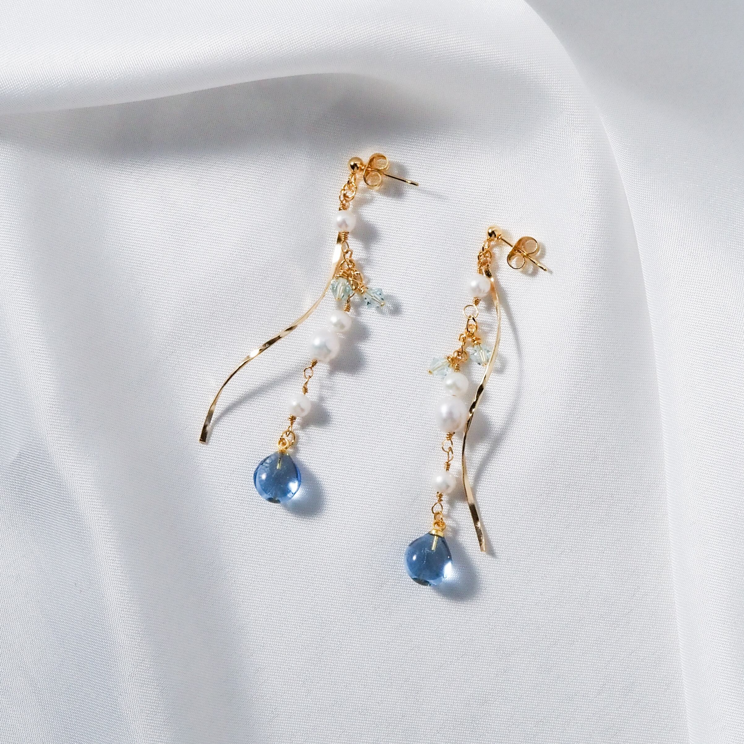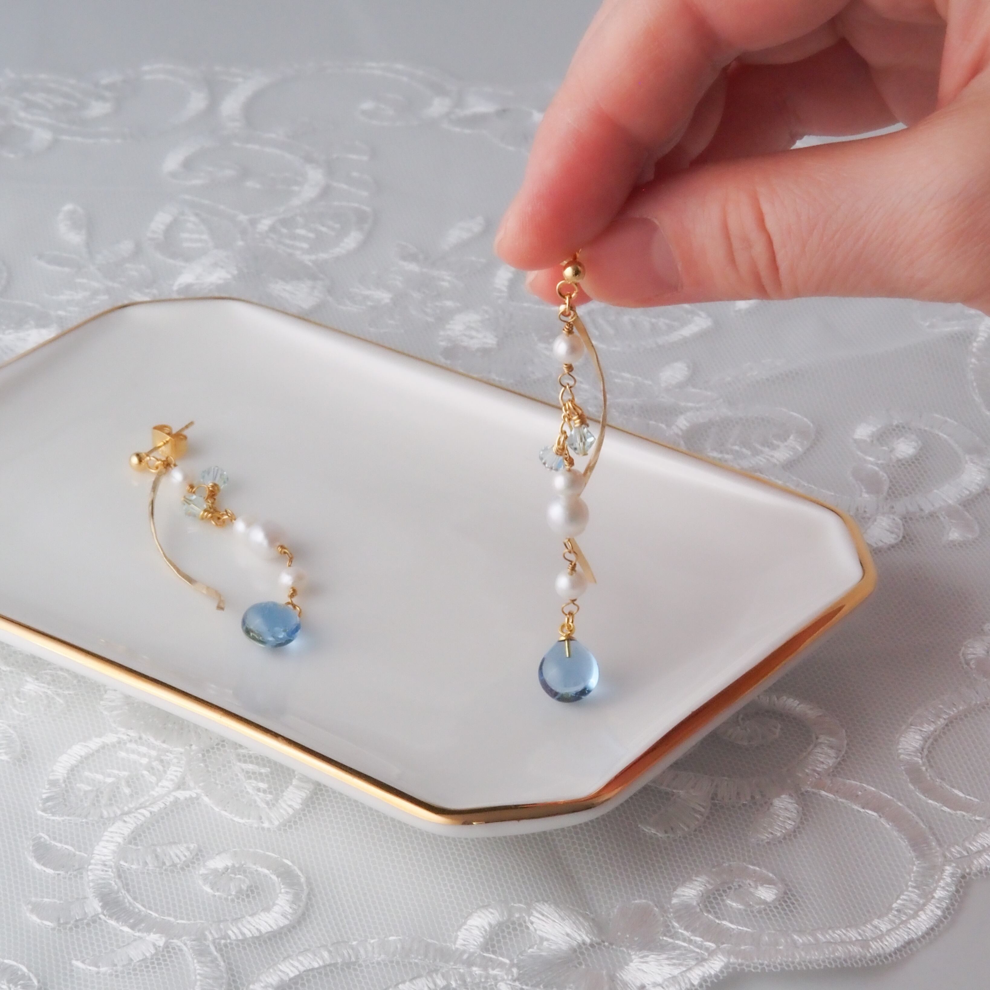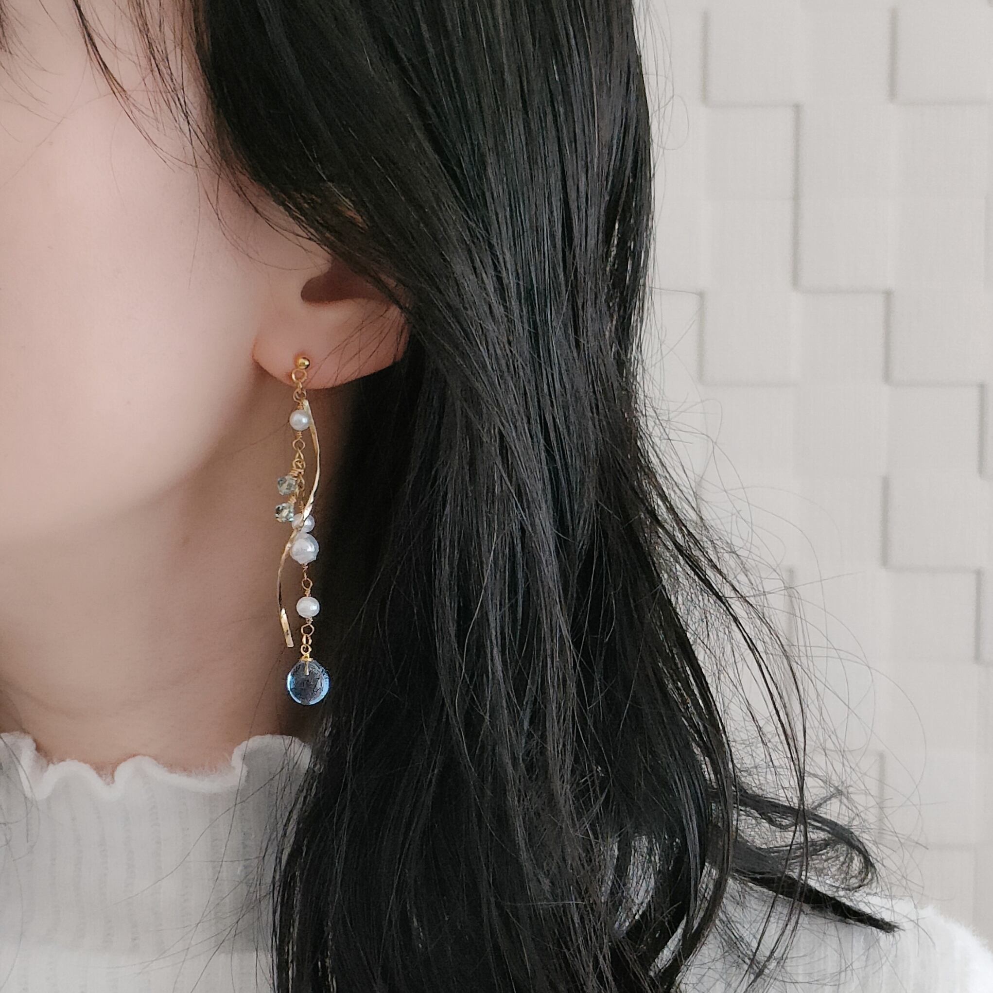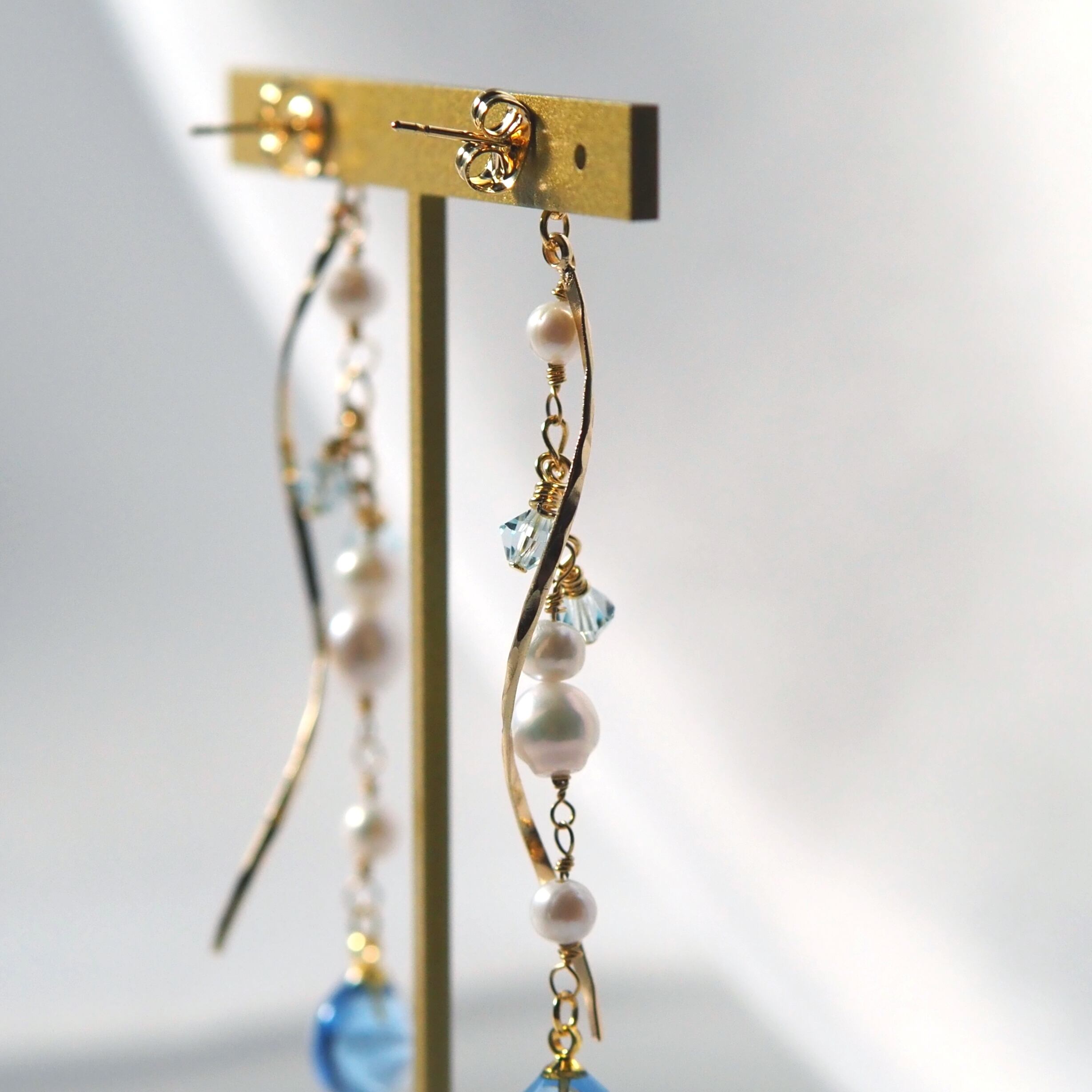 アクアマリンのやわらかな水色と、淡水パールのやさしい光沢。